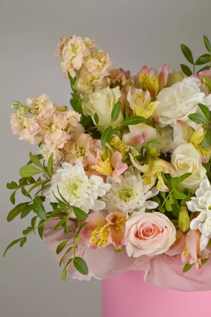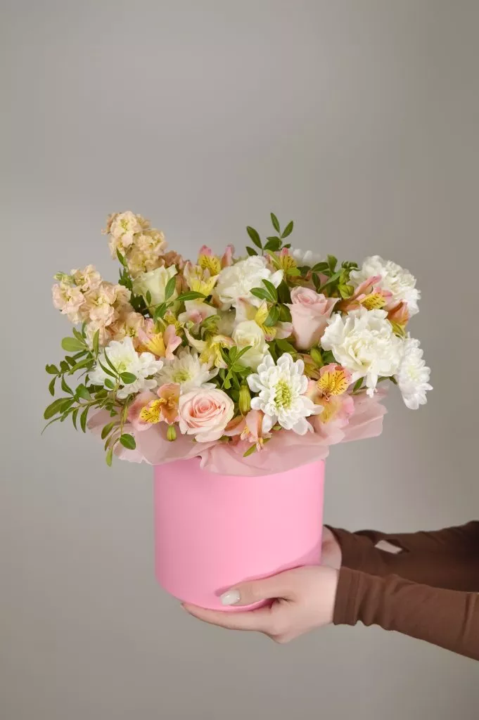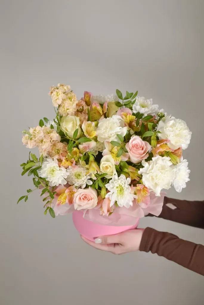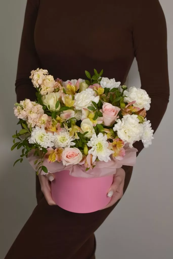Букет хризантем в коробке можно выбрать в различных цветах, что позволяет создать композицию, идеально подходящую для каждого случая. Яркие желтые, розовые, белые или красные хризантемы в коробке могут быть использованы для создания яркого и праздничного настроения. Это делает такой букет универсальным и подходящим как для романтических жестов, так и для торжественных мероприятий. Хризантемы в коробке — это также отличный выбор для украшения стола на праздниках, ведь они выглядят стильно и утонченно.